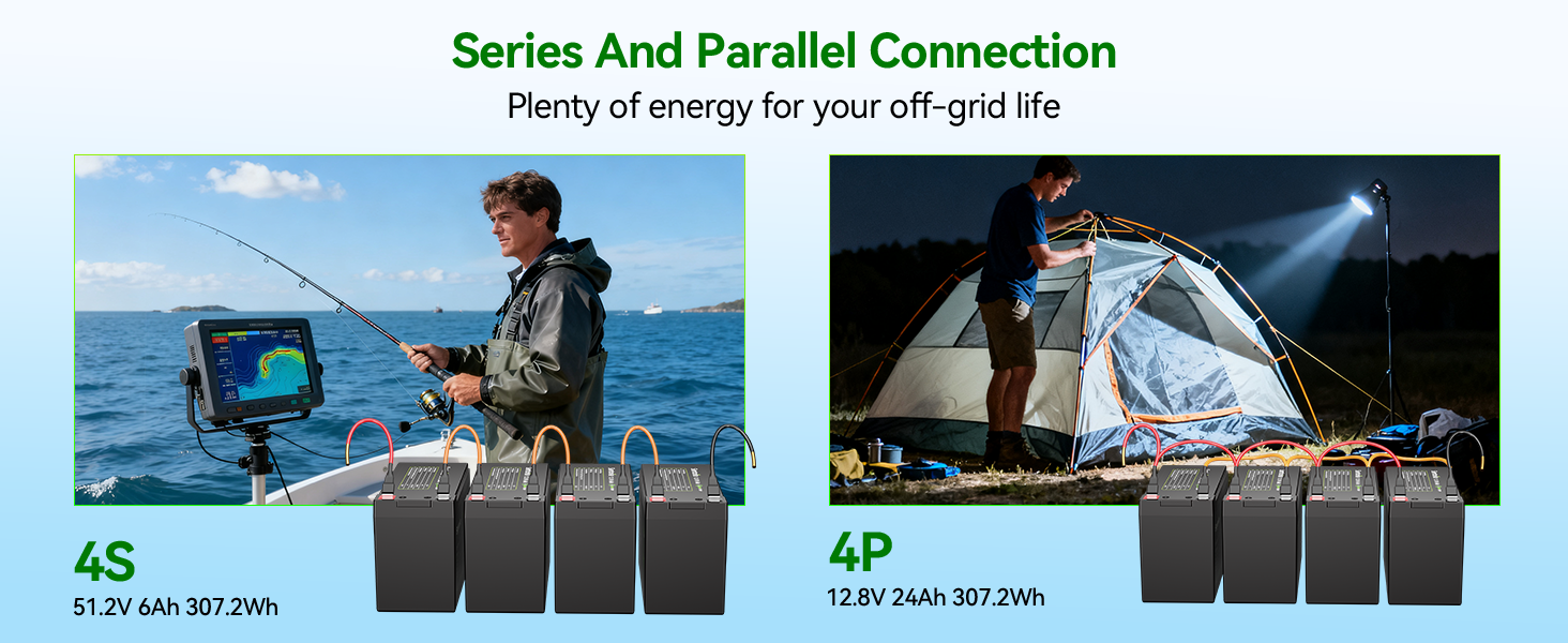 Max. 4P4S connection, up to 51.2V 24Ah battery system. (1228.8Wh Energy).