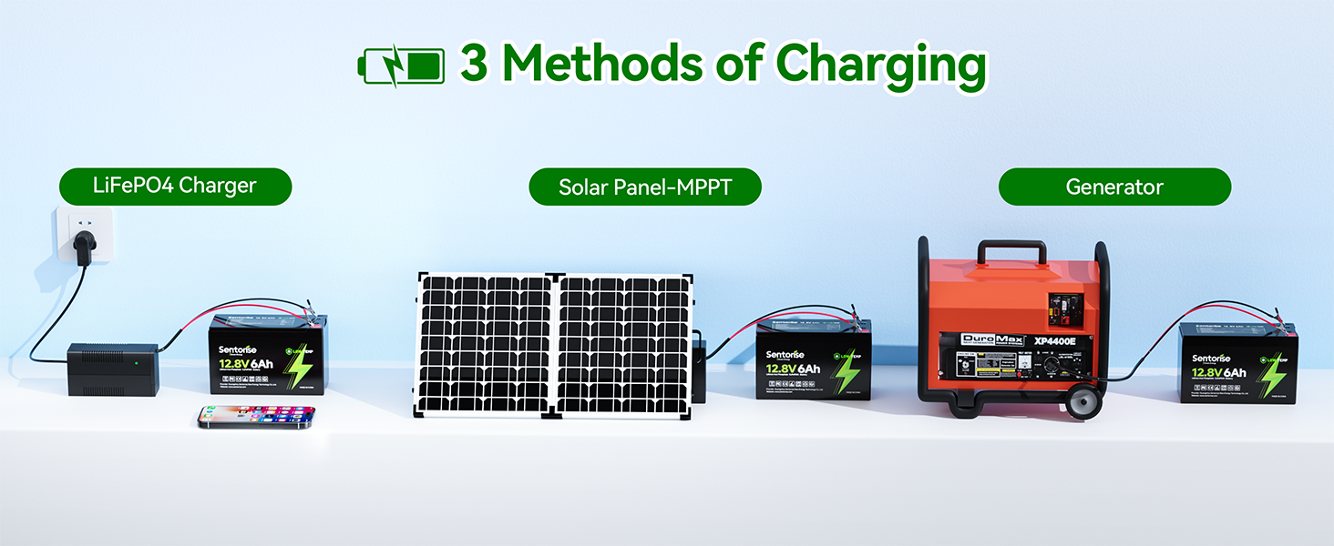 Supports 3 charging ways - LiFePO4 charger, solar panel + MPPT, generator.